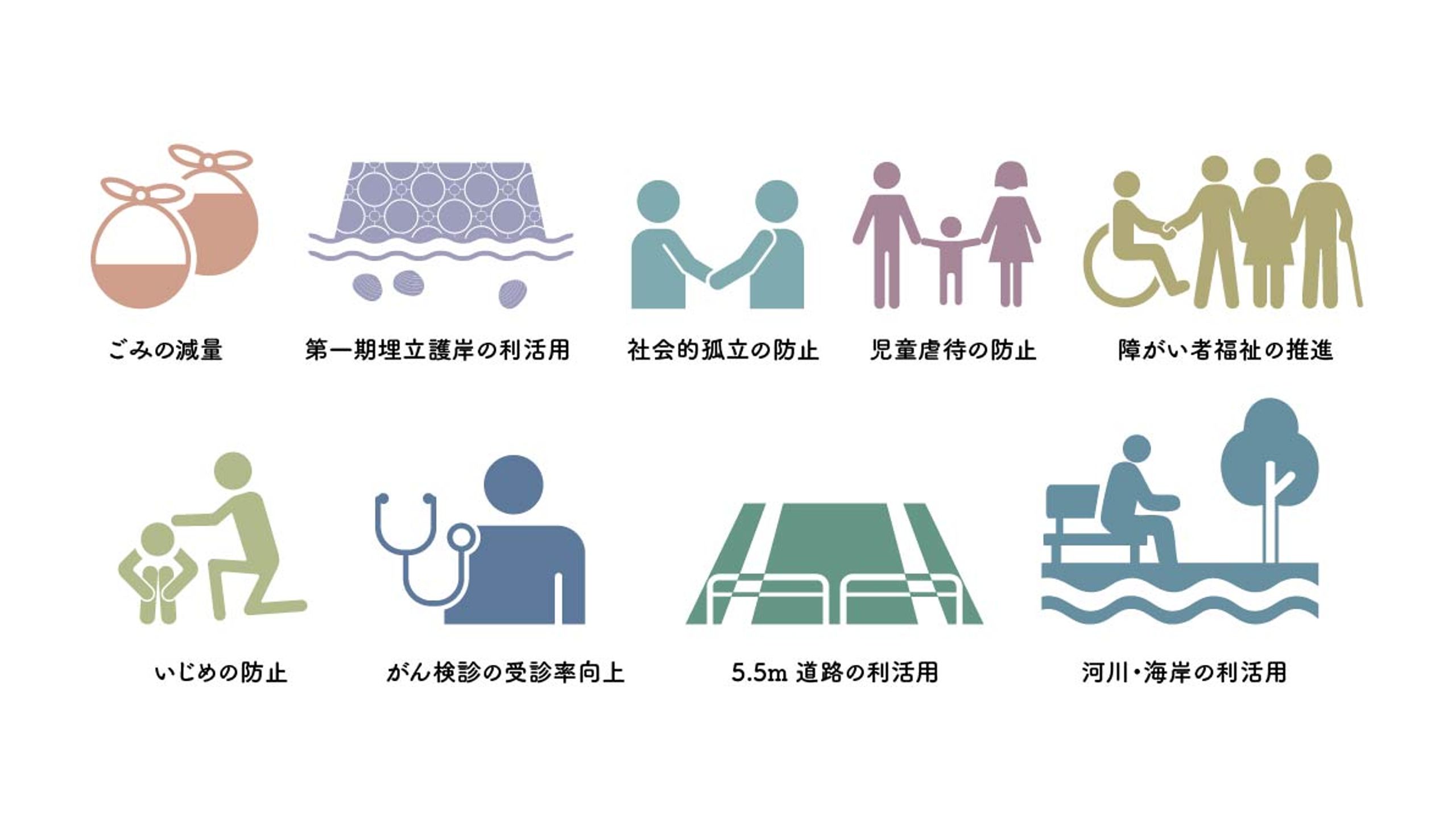 2024年度、2025年度には改めて市役所内でのリサーチをおこない、浦安市のもつ課題をさらに幅広く捉えることとなりました。そこで発見された9つの課題の中から今年度取り組む課題を選び、プログラムづくりの基盤としていきます。