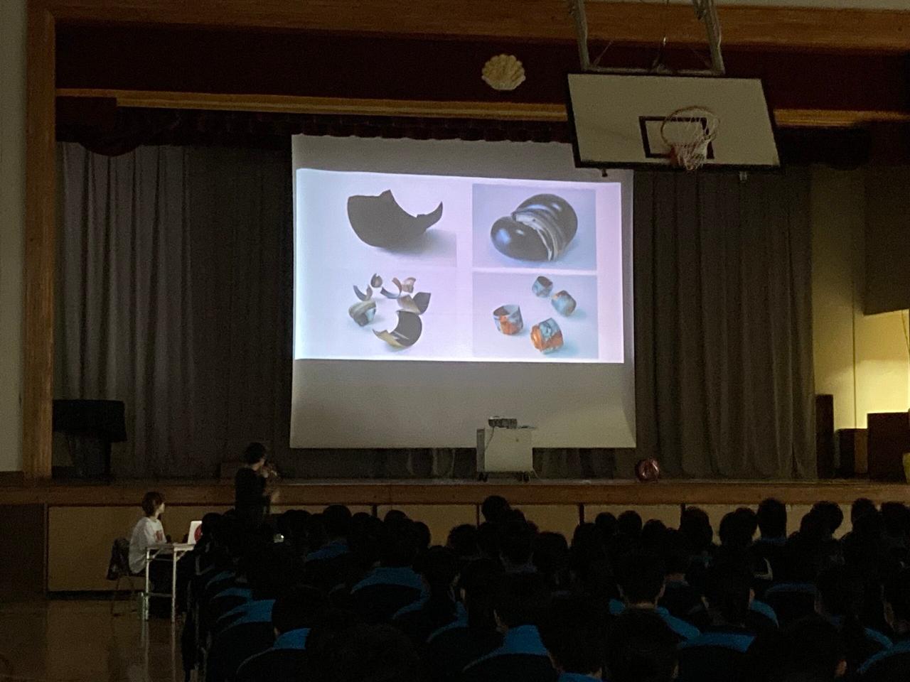 欠けてしまった古い器を、陶芸や漆の技法で修復し、新たに欠けた部分をつくり直す制作について、工程や考え方を説明します。あわせて、工芸の道を志したきっかけや、現在、浦安藝大の事務局長としてどのような仕事をしているのかについても触れました。講演では、実際に制作に使う金粉や材料、作品を手元のカメラで映しながら解説。画面に映る素材に、生徒たちからは思わず声が上がります。休み時間には、作品を実際に手に取って見たり、藝大での学生生活について質問する生徒の姿も見られました。