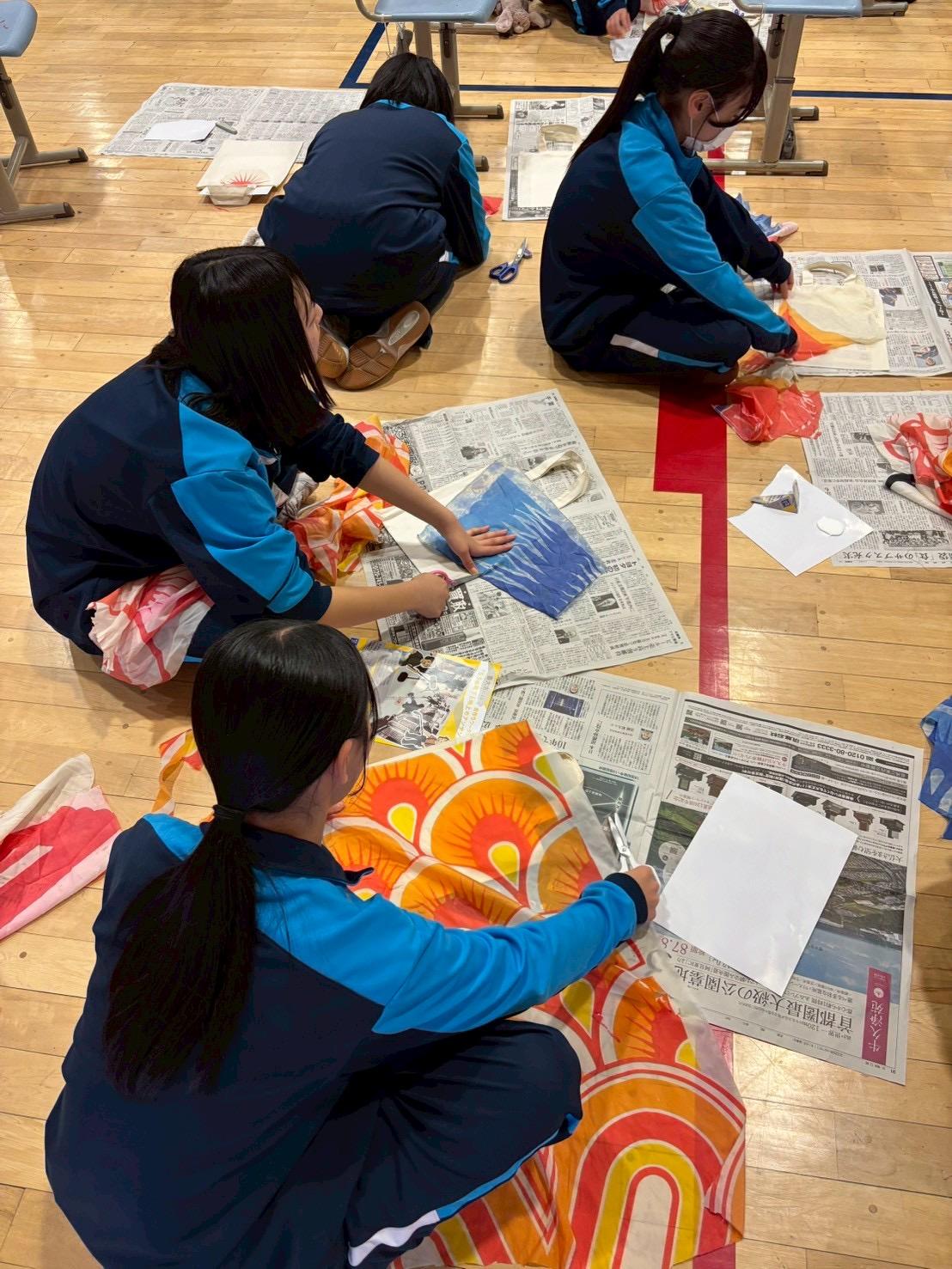 体育館には色とりどりの鯉のぼりが並び、生徒たちには無地のトートバッグとボンド、ハサミが配られました。ミヤタ先生の合図で制作が始まると、約190人の生徒が一斉に鯉のぼりのもとへ集まります。目の部分や鱗の生地を選び、切ったり割いたりしながら、素材を集めていきます。素材が行き渡ったあとは、それぞれの席で制作に取りかかります。
