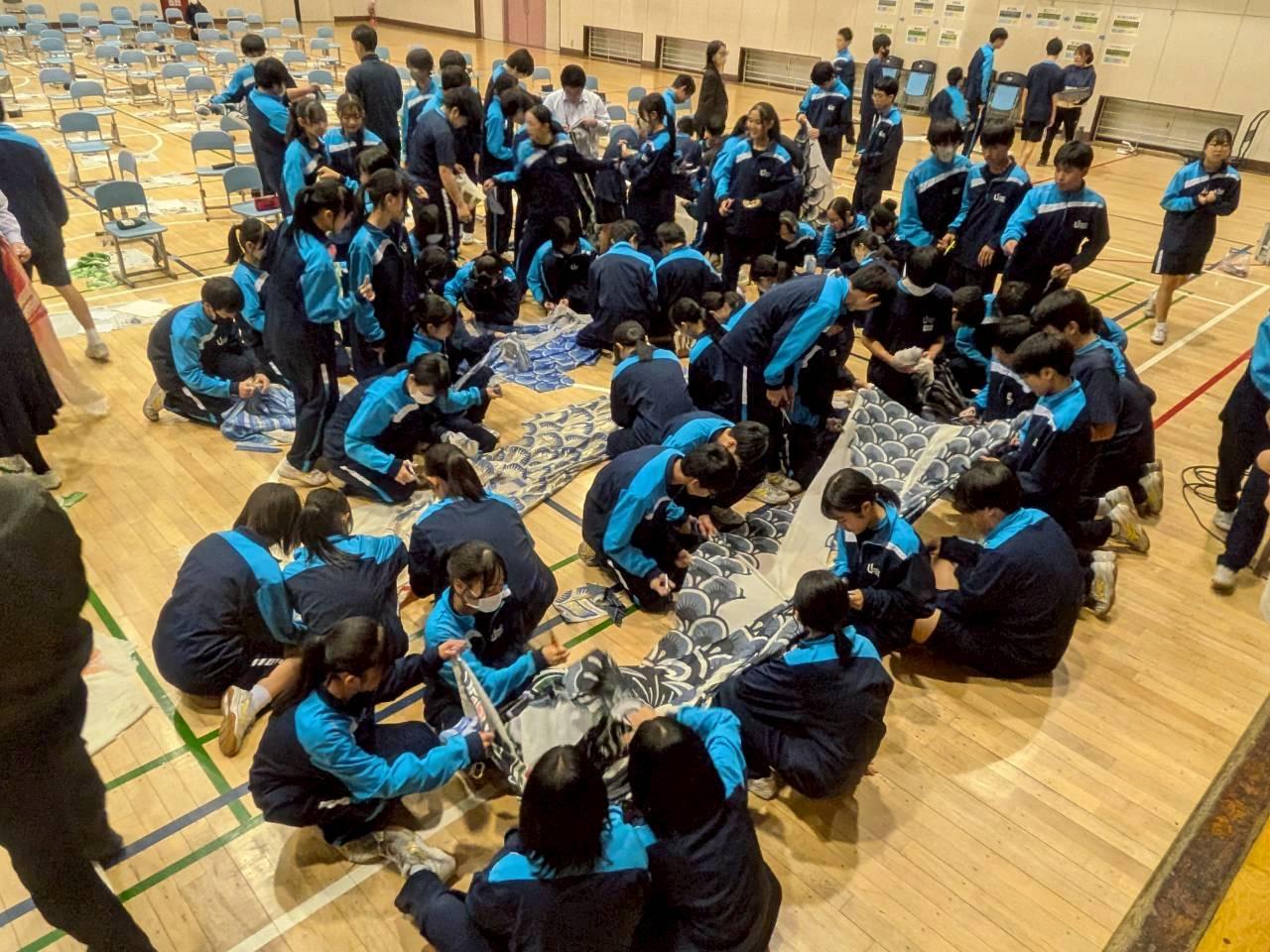 キャリア教育の後半では、ミヤタ先生がアーティストとして10年以上続けている、水府コイノボリプロジェクト「SCOI-スコイ-」を、浦安中学校の生徒たちと実際に体験しました。