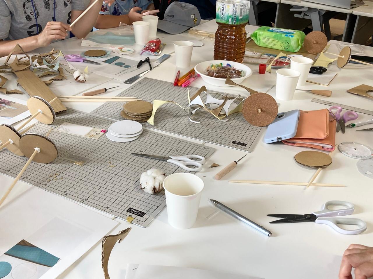 丸い箸の先端にヒートンをつけ、丸くカットしたダンボールの中心に刺す。皆さんで分業するテーブルもあれば、もくもくとひとりのコマ作りに集中するテーブルも。