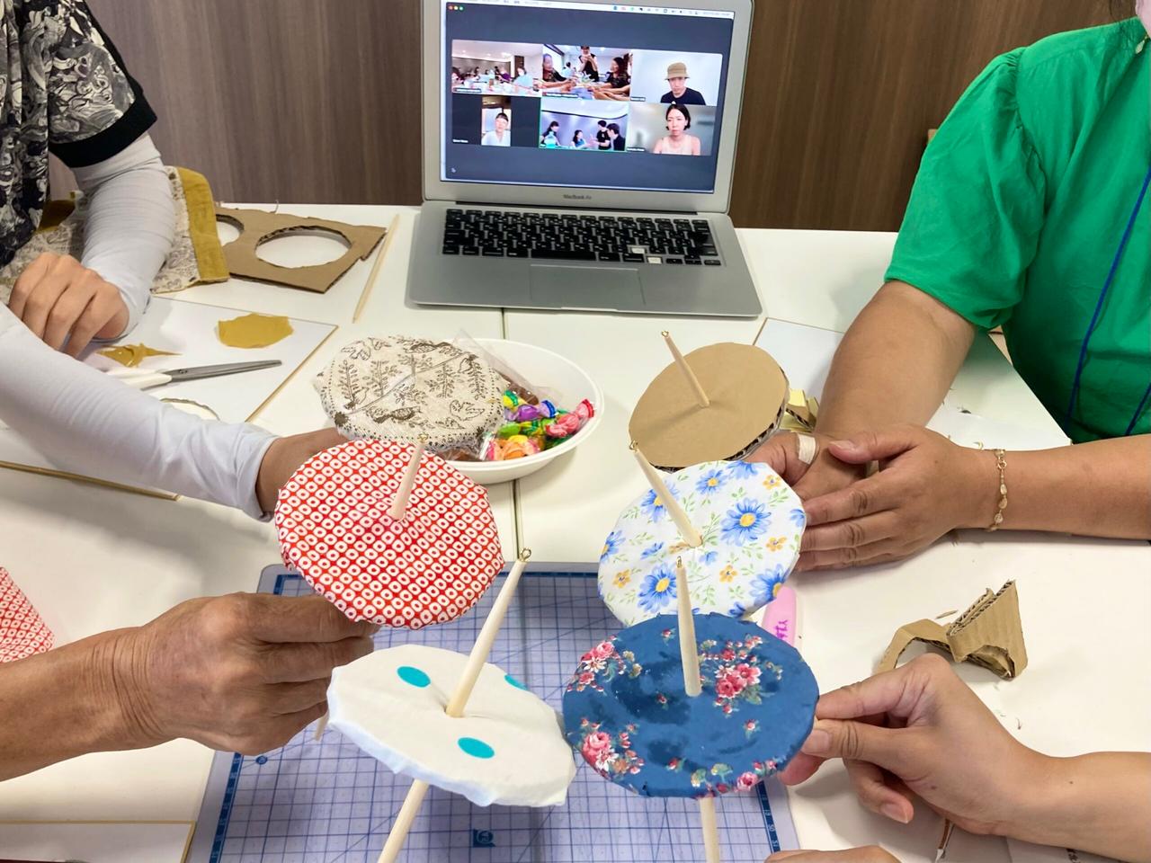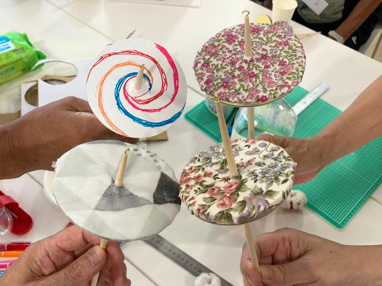 参加者の方が持参したお気に入りの布を使い、それぞれのコマに貼りつけていきます。ダンボールを丸く切り、中心に丸い箸をさしたら完成。思い出のハンカチや大切にしてきた布の切れ端など、ひとつひとつに物語が込められていて、完成したコマはまさに世界に一つだけの特別な道具。仕上がったコマを手にした瞬間、子どもも大人も思わず笑顔になっていました。