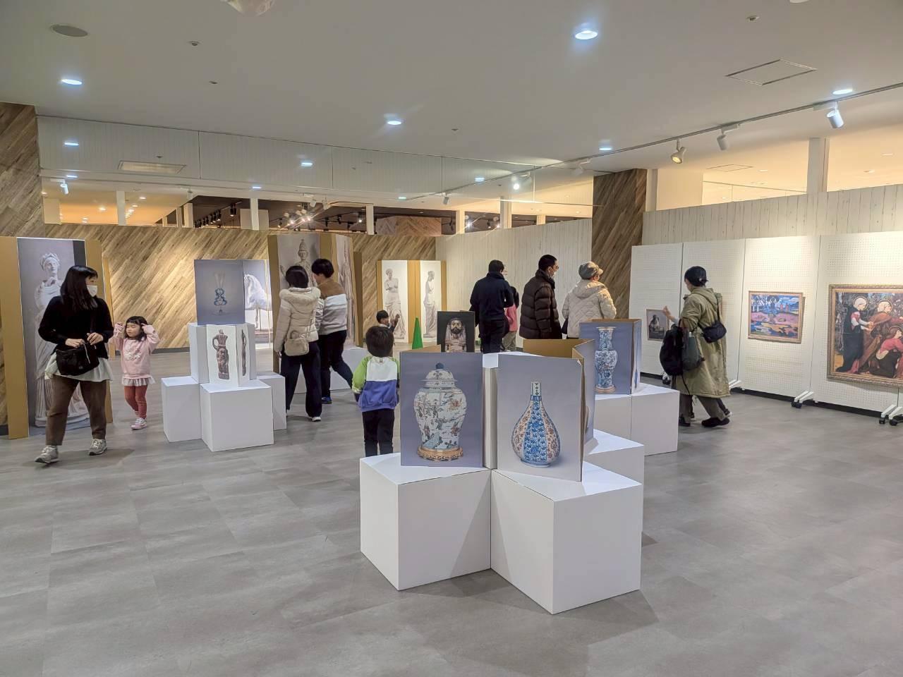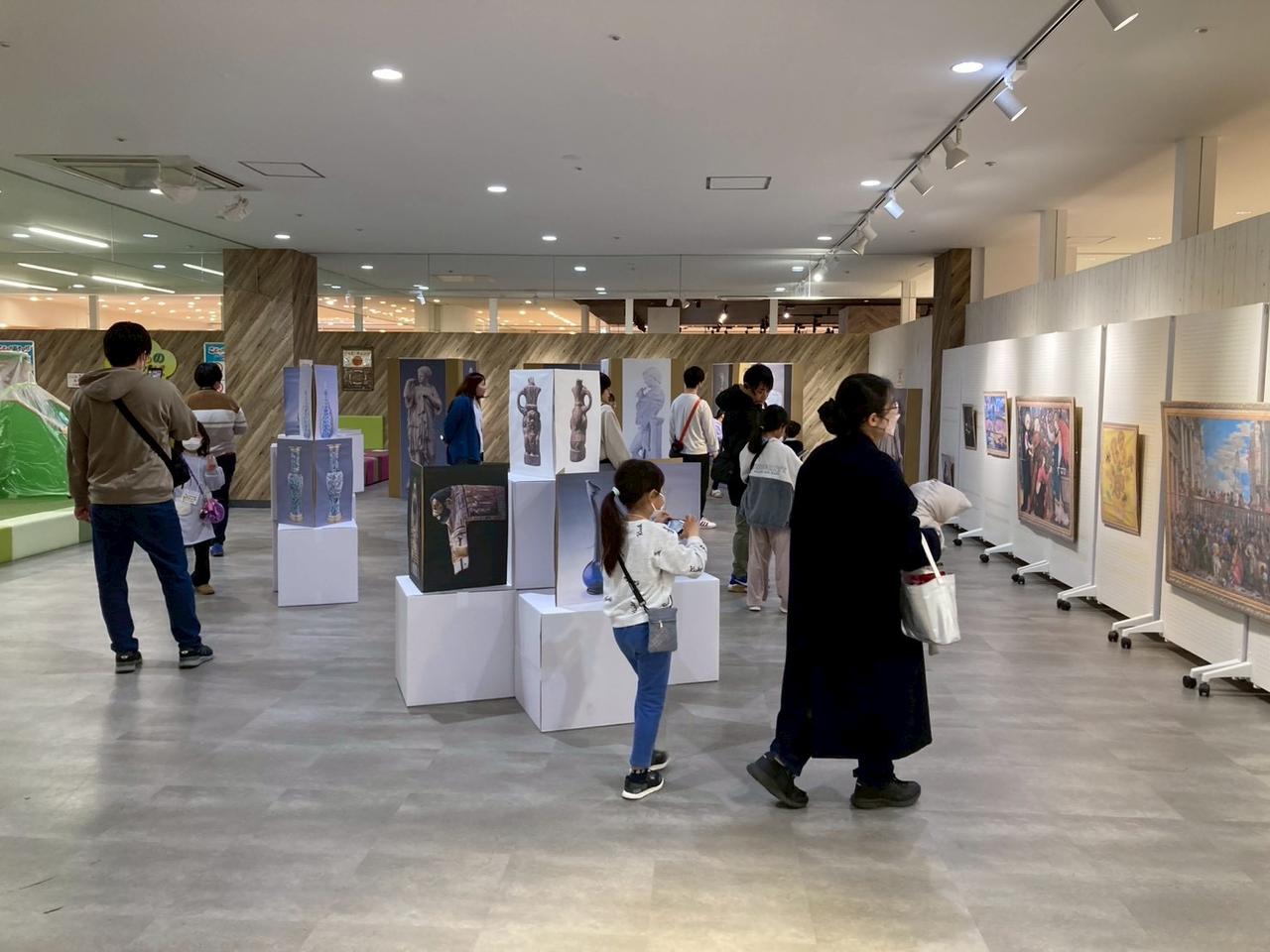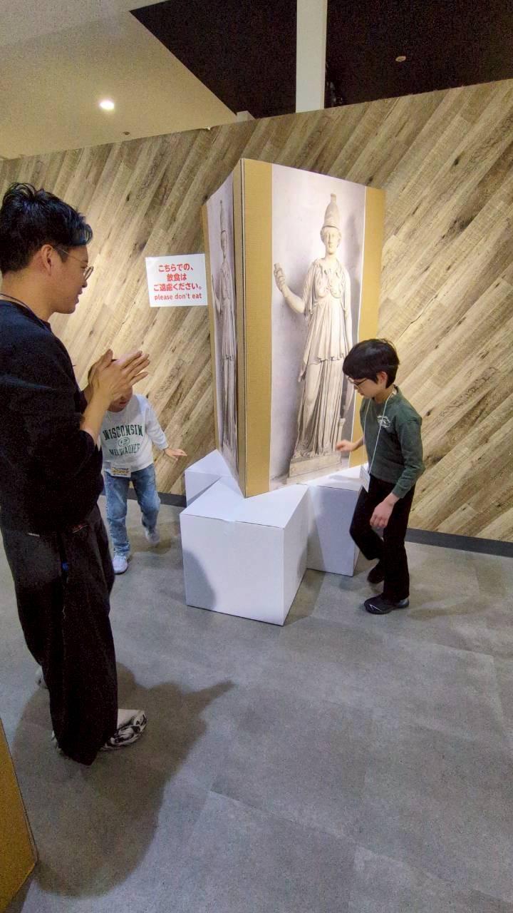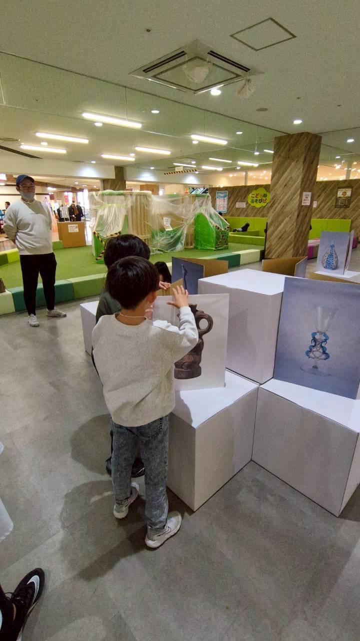会場となったのは、3Fこどものあそびば横。印刷した美術作品が貼られた段ボールを使い、参加したこどもたちが自分たちの手で展示空間を立ち上げていきます。「彫刻」「絵画」「工芸」の3つのチームに分かれ、それぞれで話し合いながら作品を配置しました。