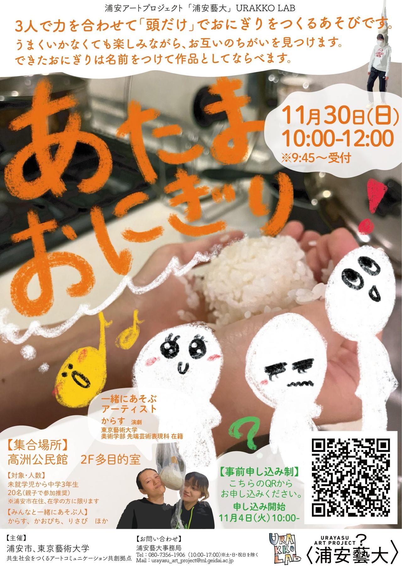 3人1組となって「頭だけを使っておにぎりをにぎる」表現ワーク。身体の不自由さや偶然性を前向きにとらえることで、子どもたちが他者との関係性や自分自身の感覚の違いに気づく場を創出します。完成したおにぎりには名前をつけ、食べる前には「作品」として展示し、制作の過程そのものを共有します。