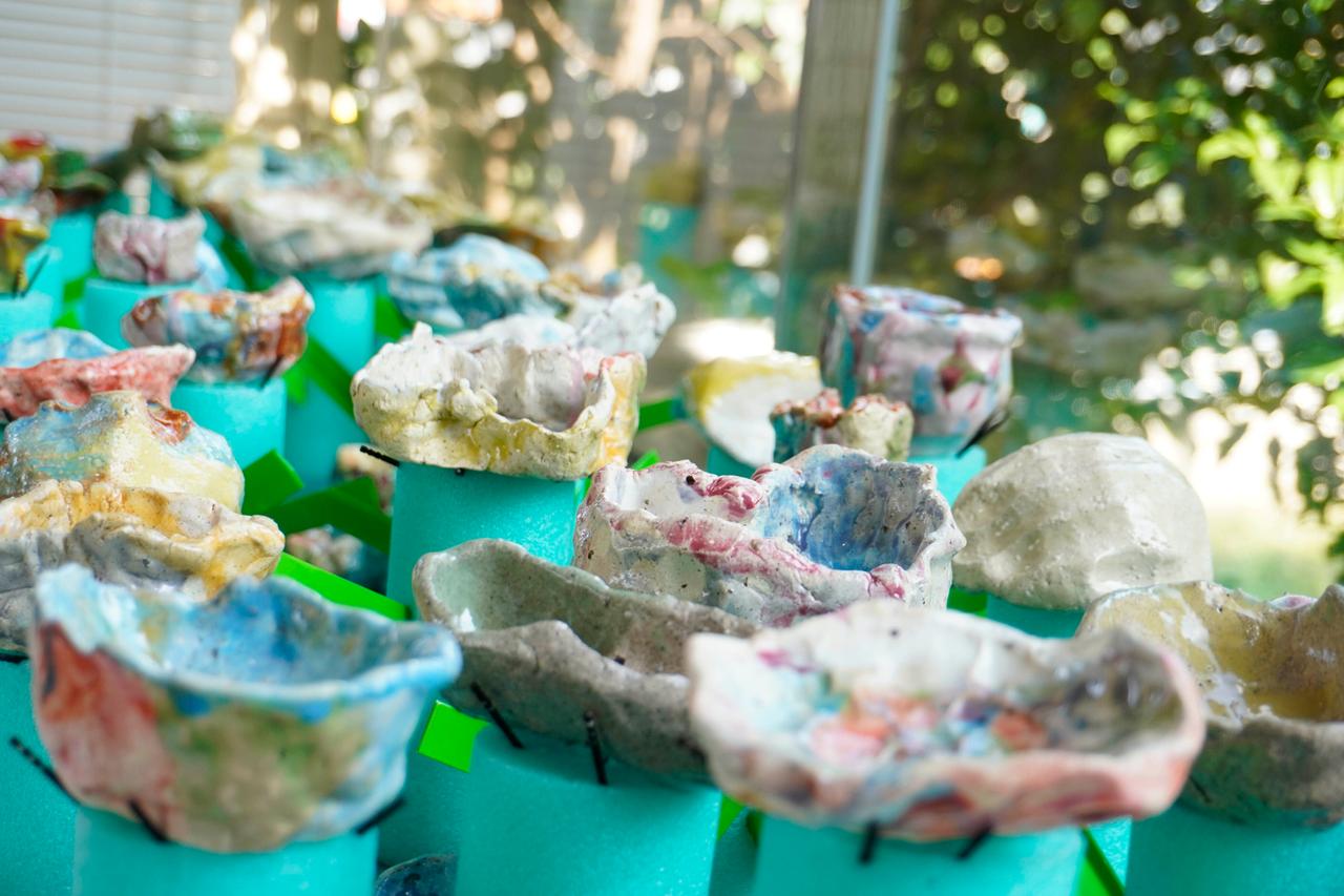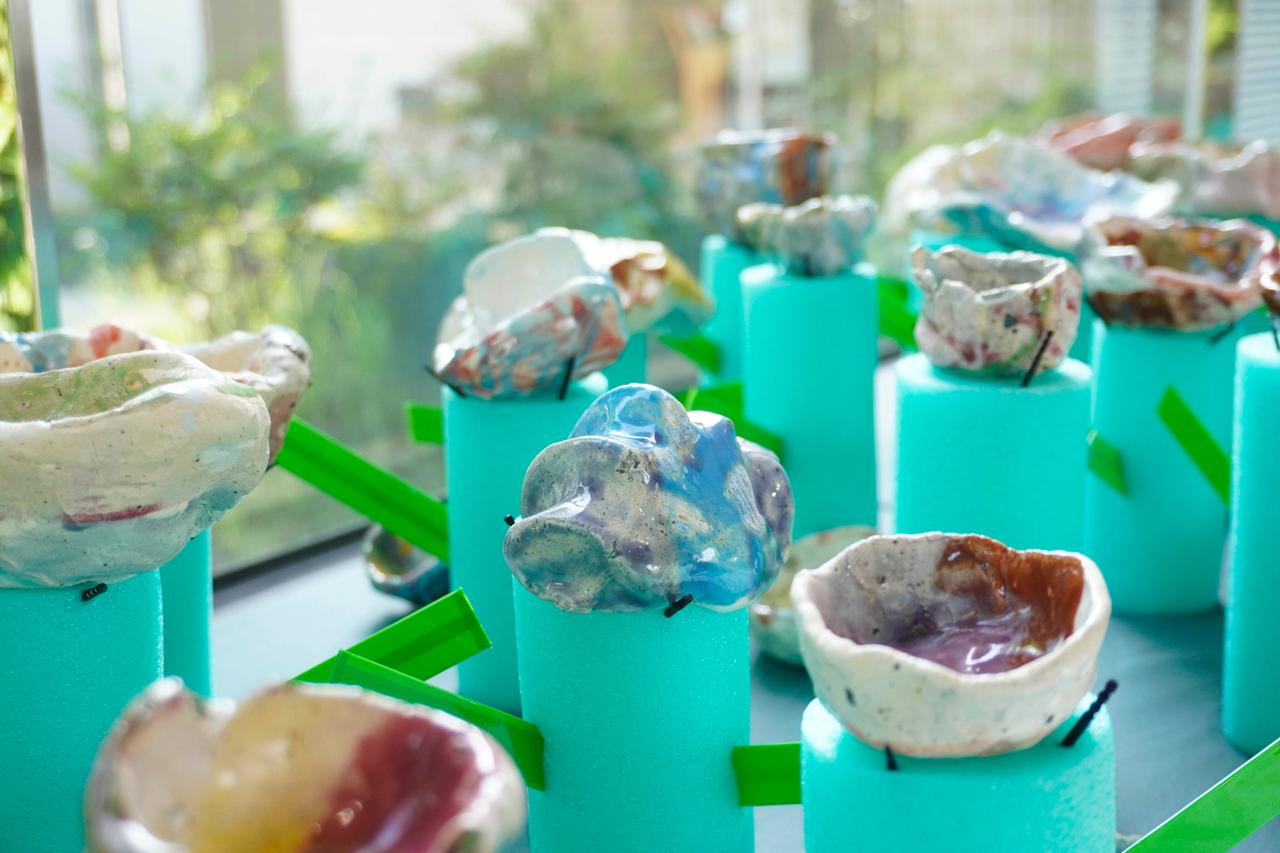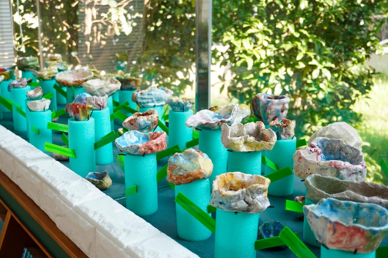 同じ学童に通う友達とのつながりから生まれた「つながりの器」を、つながりが咲かせた花に見立てて、花壇に見えるような展示を行なっています。それぞれの指のかたち、手の大きさ、思い思いに塗った鮮やかな釉薬が美しい花壇となって図書室の空間に現れています。