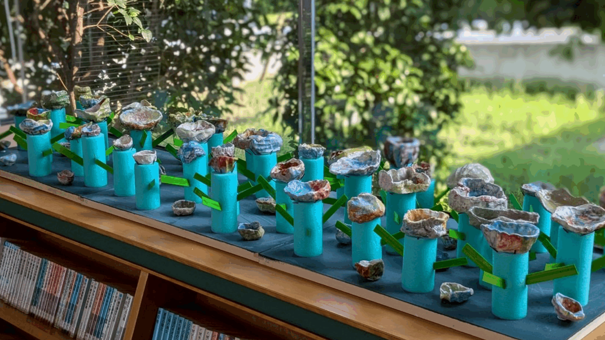 同じ学童に通う友達とのつながりから生まれた「つながりの器」を、つながりが咲かせた花に見立てて、花壇に見えるような展示を行なっています。それぞれの指のかたち、手の大きさ、思い思いに塗った鮮やかな釉薬が美しい花壇となって図書室の空間に現れています。