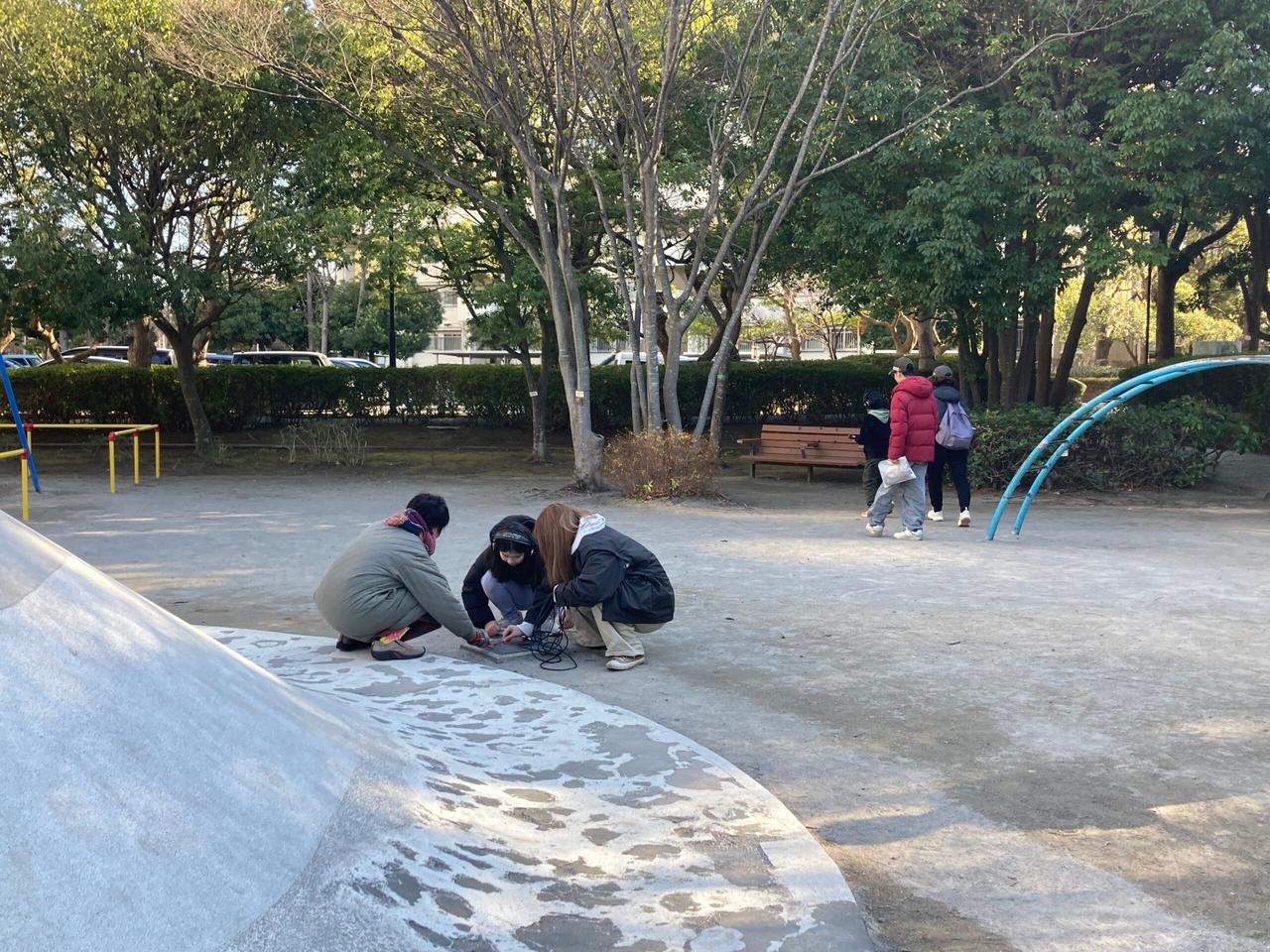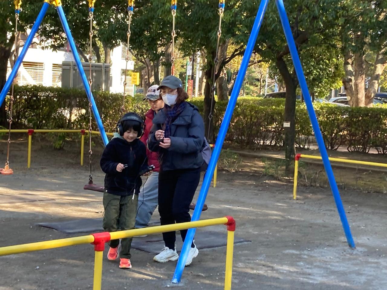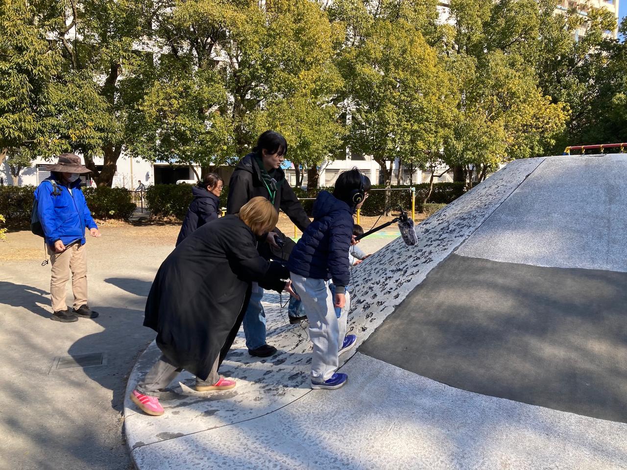 参加者は3つのチームに分かれ、それぞれ音探しを始めました。同じ公園にいても、集まってくる音はさまざまです。葉っぱが揺れる音、水道の蛇口から水が流れる音、足で砂をこする音、ブランコがきしむ金属の音など、耳を澄ますことで、普段は意識しない音に次々と気づいていきました。