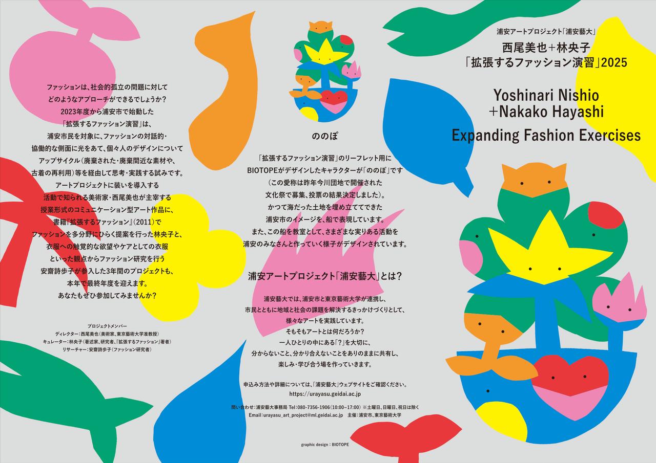 装いの行為とコミュニケーションの関係性に着目したアートプロジェクトを展開する西尾美也(にしお よしなり)のディレクションするプログラムでは、『拡張するファッション』の著者・林央子(はやし なかこ)をキュレーターに、ファッション研究者・安齋詩歩子(あんさい しほこ)をリサーチャーに迎え、「拡張するファッション演習」を2023年から展開しています。人が生きている限り関わり続けるファッションの対話的な側面に着目して、浦安市の課題を内包したプログラムに取り組みます。