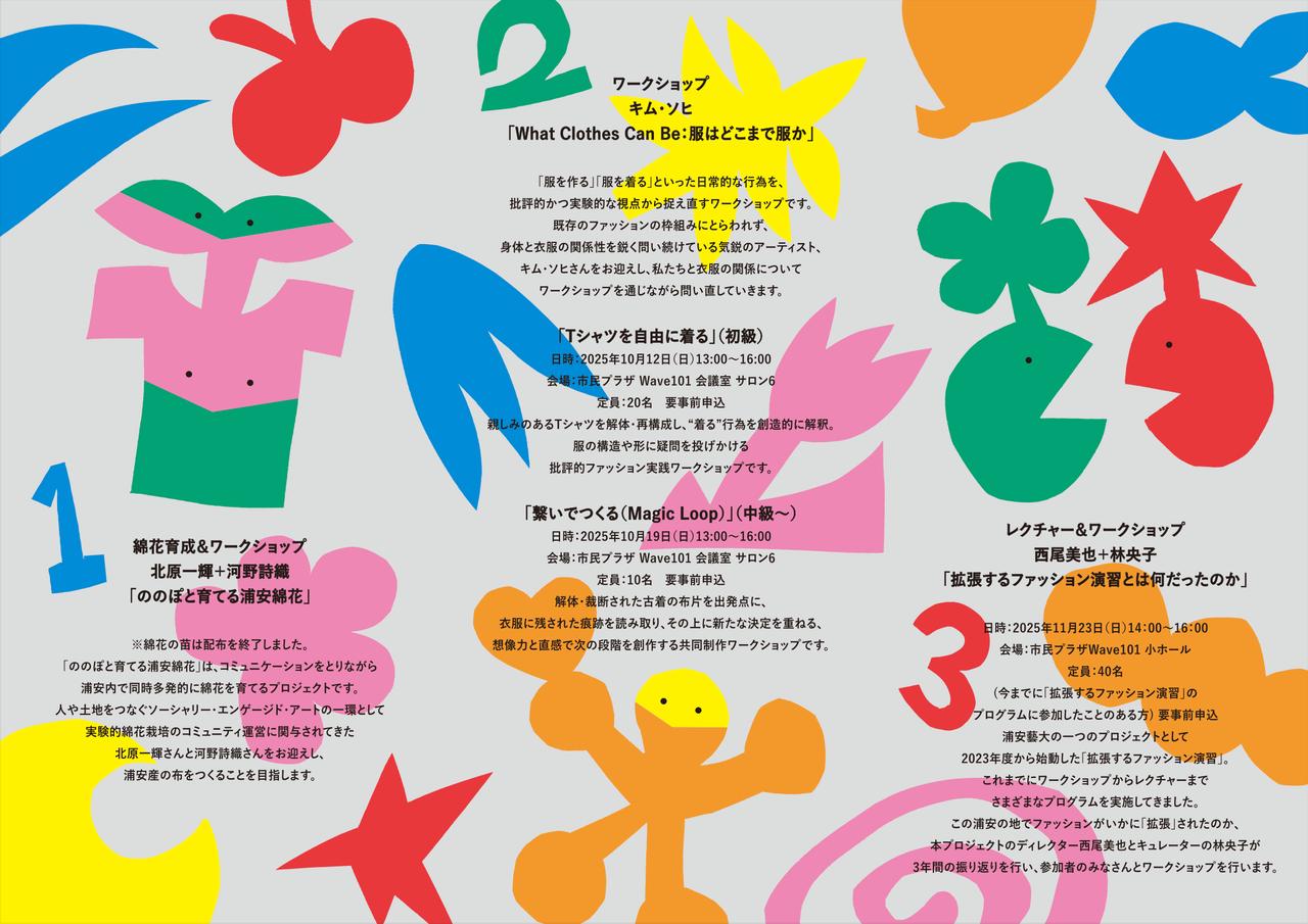 これまでにワークショップからレクチャーまでさまざまなプログラムを実施してきました。この浦安の地でファッションがいかに「拡張」されたのか、本プロジェクトのディレクター西尾美也とキュレーターの林央子が3年間の振り返りを行い、参加者のみなさんとワークショップを行います。